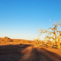 Hommikusööki sööme täna tsiviliseeritult: hotellis. Seejärel võtame suuna tagasi põhja, seda korda Sossusvleisse. Teekond on pikk, bussis veedame pool päeva. Aga see tasub ennast ära. „Kõigesid“ on siin palju. Sossusvlei on Namiibia kõige olulisem vaatamisväärsus. Sossuvlei düüne loetakse maailma kõrgeimateks. Lisaks nendele „kõigedele“ on siin ka äärmiselt maaliline. Võimsad, oranž-punased liivadüünid, nende taustaks hall-valged kuivanud soola-savi väljad. Ning nagu sellest veel ei jaguks: siin-seal turritavad kuivanud surnud puujändrikud. Sekka mõnel pool ka elus akaatsiapuud.