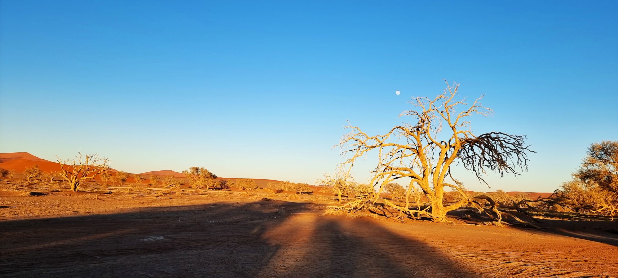 Hommikusööki sööme täna tsiviliseeritult: hotellis. Seejärel võtame suuna tagasi põhja, seda korda Sossusvleisse. Teekond on pikk, bussis veedame pool päeva. Aga see tasub ennast ära. „Kõigesid“ on siin palju. Sossusvlei on Namiibia kõige olulisem vaatamisväärsus. Sossuvlei düüne loetakse maailma kõrgeimateks. Lisaks nendele „kõigedele“ on siin ka äärmiselt maaliline. Võimsad, oranž-punased liivadüünid, nende taustaks hall-valged kuivanud soola-savi väljad. Ning nagu sellest veel ei jaguks: siin-seal turritavad kuivanud surnud puujändrikud. Sekka mõnel pool ka elus akaatsiapuud.