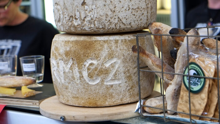 Two cheese wheels stacked on the counter of a stall